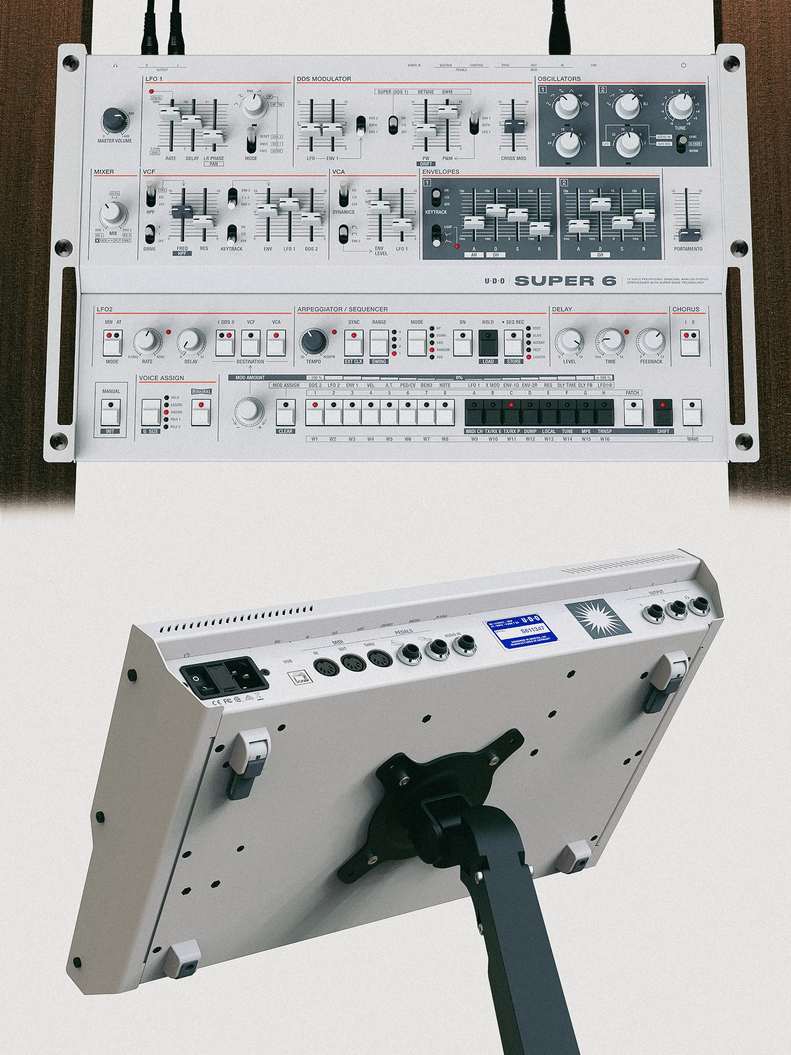 The Super 6 Desktop is our fully-featured 12-voice polyphonic, binaural analog-hybrid synthesizer reimagined in a compact and hyper-flexible package. UDO's inaugural production synthesizer, the Super 6 is a result of many years of hard work and numerous iterations of development. Our mission with the Super 6 has been to harmonise what we love about archetypal electronic instrument design with modern, novel synthesis technologies that excel at generating spatially dynamic sonic results.