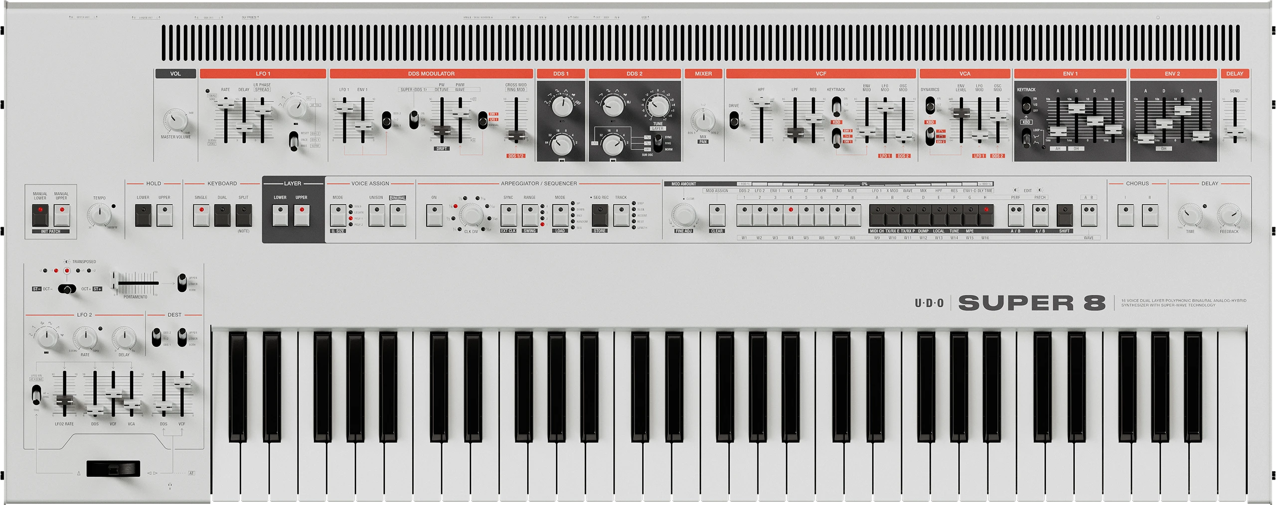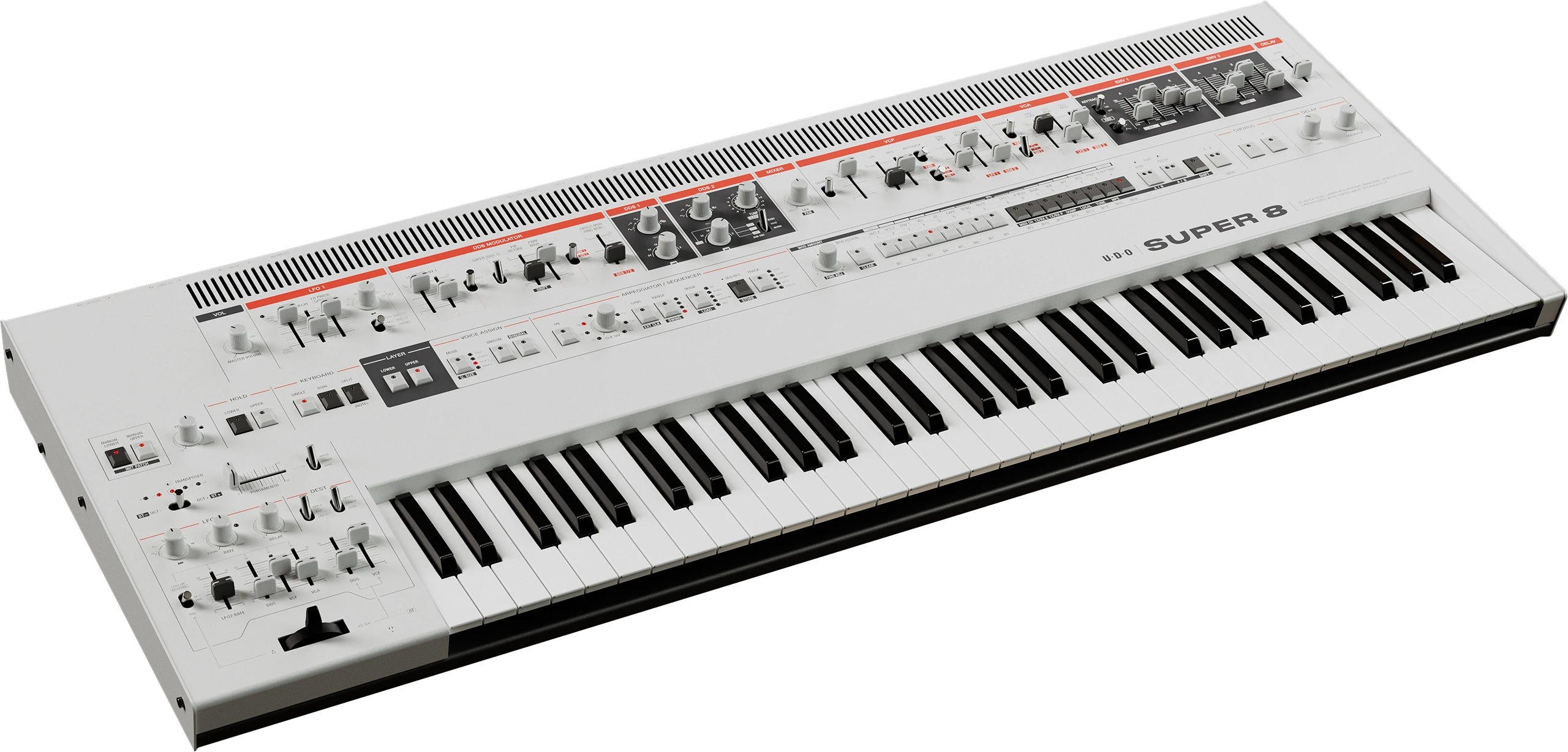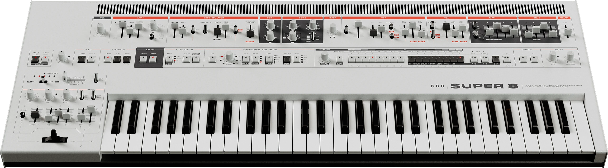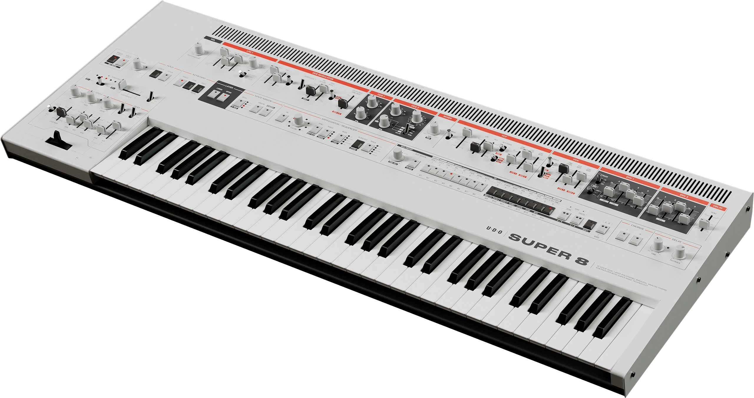 As the next evolution in the Super family, the 16-voice Super 8 sits confidently between the Super 6 and the Super Gemini. This synth is the distillation of the UDO philosophy of the power of play — with the dual cores and playability features of it’s bigger cousin, all in a more compact and simplified presentation — it’s the best of both worlds.